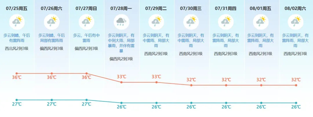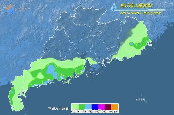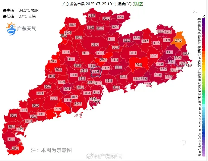 广东省气象台预计,7月25日—26日,广东中北部市县有高温天气,部分市县有分散雷雨。7月27日,广东东部市县有中雷雨。
